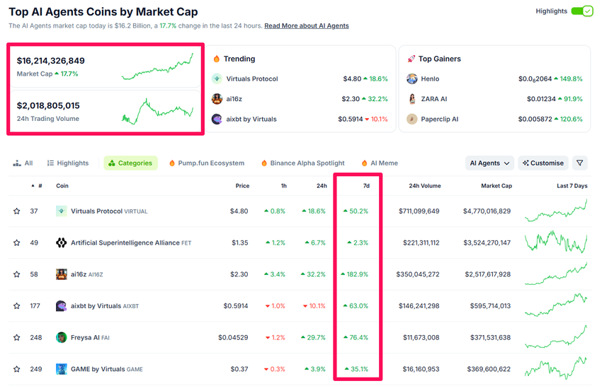 SponsoredMarket Cap AI Agent Tembus US$16 Miliar, Banyak Token Catat Pertumbuhan Tiga Digit