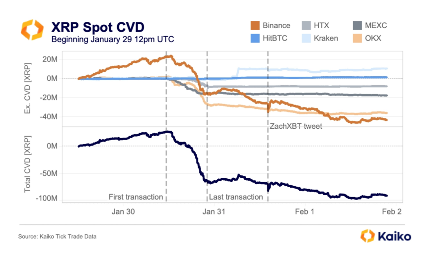 Firma analitik blockchain Kaiko menyajikan wawasan mengenai dampak dari serangan siber terbaru ini. Analisis mereka mengungkap Cumulative Volume Delta (CVD) yang mengindikasikan penjualan bersih sebesar hampir 100 juta XRP, terutama lewat sejumlah crypto exchange terkemuka seperti Binance dan OKX.