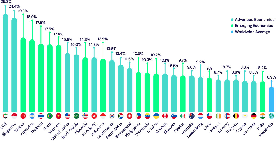 Posisi tiga besar dikuasai oleh Uni Emirat Arab (UEA), Singapura dan juga Turki dengan persentase kepemilikan kripto masing-masing sebanyak 25,3%, 24,4% dan 19,3%. Kuat dugaan jumlah tersebut akan terus bertumbuh karena 65% dari responden mengaku ingin menggunakan aset kripto untuk pembayaran, yang pada akhirnya akan mendorong terjadinya adopsi lebih besar.