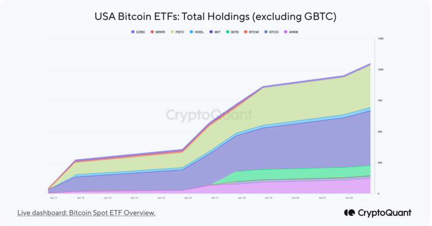 Selain itu, telah terjadi pertumbuhan dalam total kepemilikan Bitcoin di exchange-traded fund (ETF) spot AS. Walaupun ada arus keluar dari GBTC, sejumlah ETF lainnya kini telah memegang sekitar 104.000 BTC.