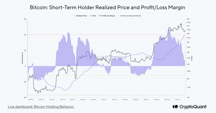 Pertama, perilaku holder jangka pendek menjadi sinyal penting. Margin profit yang belum terealisasi punya mereka kini nyaris mencapai nol. Meski begitu, titik bottom pasar yang terkonfirmasi biasanya ditandai saat margin ini mencapai -10%. Menurut CryptoQuant, saat ini, area support harga Bitcoin berkisar di antara US$39.000 sampai dengan US$37.000. Data ini menunjukkan potensi stabilisasi pasar dalam waktu dekat.