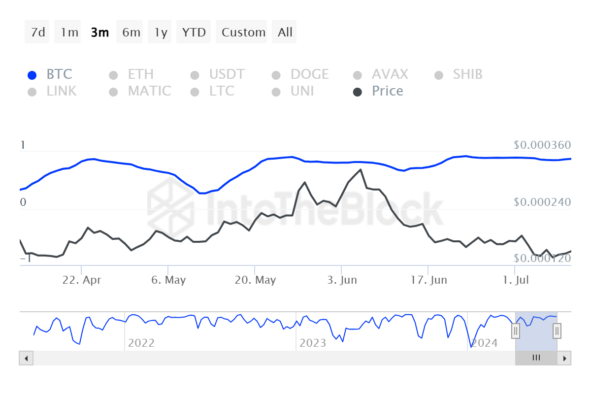 Selain itu, FLOKI saat ini memiliki korelasi yang tinggi dengan Bitcoin, yaitu sebesar 0,84. Korelasi ini menunjukkan bahwa pergerakan harga Floki sangat mirip dengan BTC. Akibatnya, FLOKI dinilai memiliki potensi pemulihan yang kuat, mengikuti tren yang ditetapkan oleh Bitcoin.