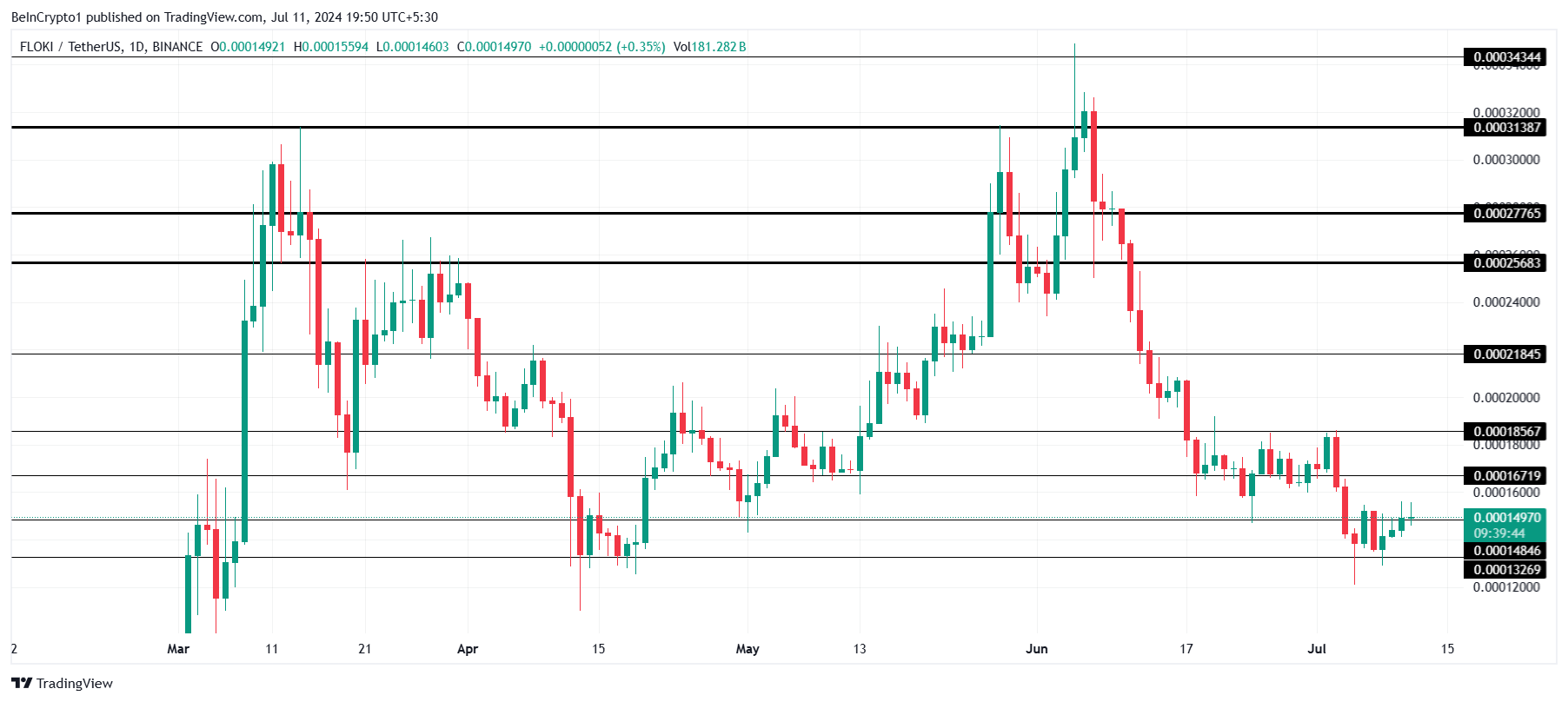 Harga Floki saat ini di US$0,0001497 sedang berusaha pulih usai berhasil mengubah resistance US$0,0001856 menjadi support. Hal ini penting bagi meme coin ini karena akan memungkinkan reli menuju US$0,0002000 dan mengembalikan profit yang hilang.