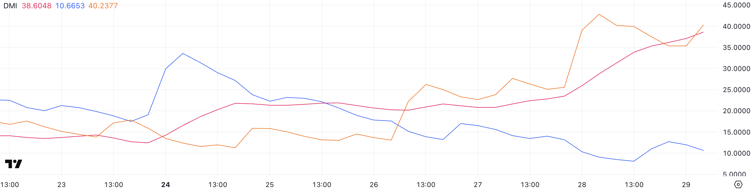 Selain itu, Directional Movement Index (DMI) Ethereum semakin mempertegas skenario bearish. Average Directional Index (ADX), yang mengukur kekuatan tren, meroket ke 38,6 dari 23,47 hanya dalam sehari—menunjukkan bahwa momentum turun semakin solid.