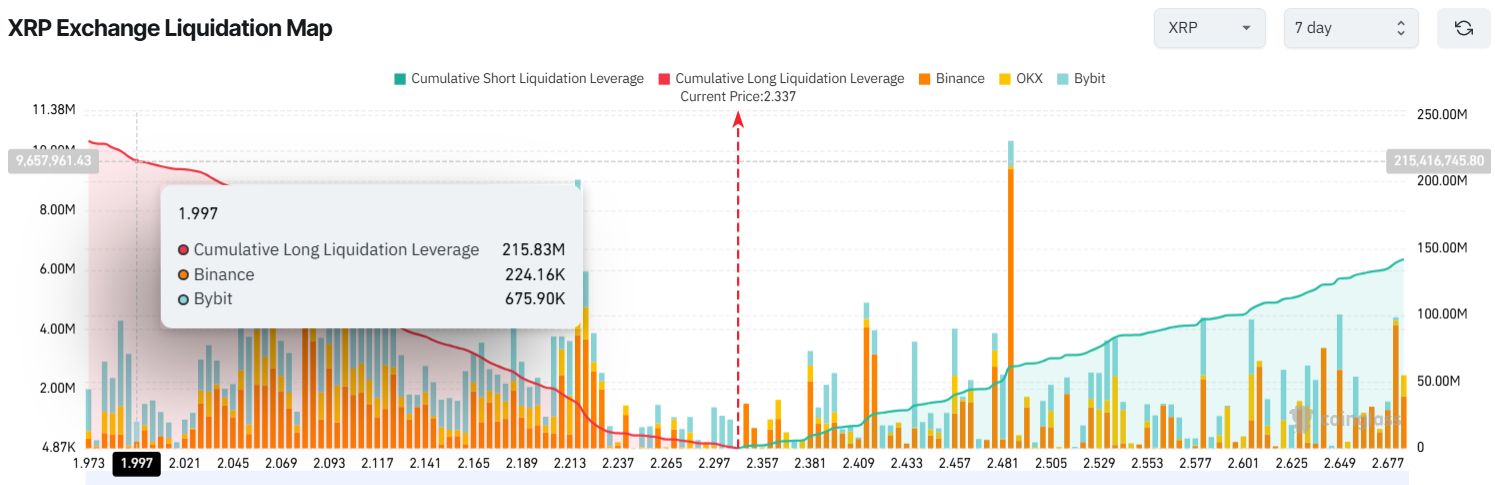 Peta likuidasi tujuh hari untuk XRP menunjukkan bahwa jika harga turun ke bawah US$2, total likuidasi posisi long bisa melampaui angka US$215 juta.