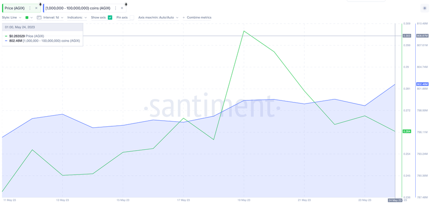 Antara tanggal 11 Mei dan 25 Mei, para whale yang memegang saldo antara satu juta hingga 10 juta token AGIX melakukan akumulasi yang signifikan. Grafik di bawah menunjukkan bagaimana mereka memborong 7 juta AGIX ke saldo mereka selama periode itu.