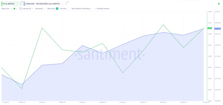 Luar biasanya, grafik Santiment di atas menunjukkan bagaimana harga MATIC terdongkrak ketika whale mulai membeli token tersebut di sekitar tanggal 16 Mei.
