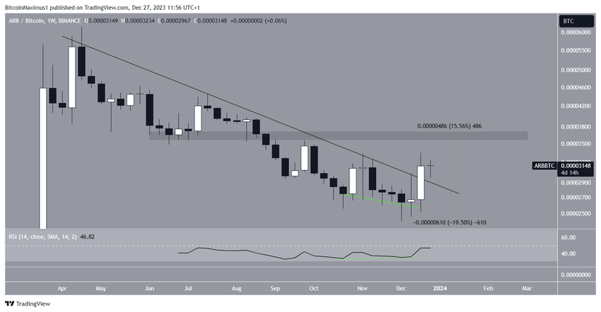 Altcoin terakhir yang berpotensi mengungguli performa Bitcoin adalah Arbitrum (ARB). Sama seperti dua =altcoin lainnya, harga ARB juga berhasil breakout dari garis tren descending resistance minggu lalu.