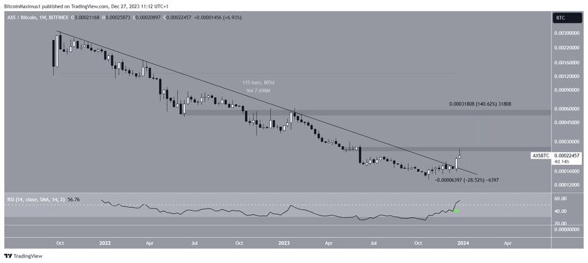 Harga AXS telah anjlok di bawah garis tren descending resistance jangka panjang sejak Oktober 2021. Penurunan ini menyeret harga turun sampai ke level terendah di 13.400 satoshi pada Oktober 2023.