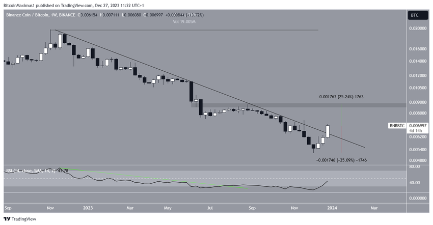 Harga BNB telah amblas di bawah garis tren descending resistance jangka panjang sejak November 2022. Penurunan ini mengakibatkan terbentuknya level terendah ₿0,0051 pada bulan Desember.