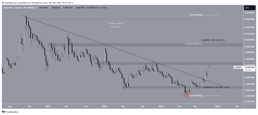 Ketika breakout, garis trennya sudah bertahan selama lebih dari 1.150 hari. Sementara itu, LINK mendekati area resistance horizontal 43.000 satoshi, yang telah ada sejak awal tahun 2022.