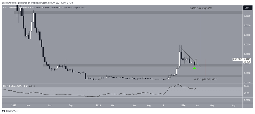 Sejak terjadinya pemantulan, RAY berhasil menerobos keluar dari garis tren resistance menurun jangka pendek. Dan meski indikator RSI telah merosot sejak Desember 2023, angkanya terpantau masih bertengger di atas 50 dan sepertinya telah kembali menancapkan pijakannya minggu ini. Jika breakout ini berhasil, RAY berpeluang naik setinggi 200% menuju resistance berikutnya di US$3,70.