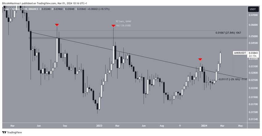 Harga ANKR telah tergelincir ke bawah garis tren resistance menurun (descending resistance) sejak Mei 2022. Garis tren ini menyebabkan terjadinya tiga penolakan besar. Ketiga aksi penolakan ini menelurkan sumbu atas yang panjang (long upper wick). Untungnya, ANKR kembali memulai pergerakan naik pada Februari 2024 dan berhasil breakout dari garis tren resistance menurun usia 644 hari.