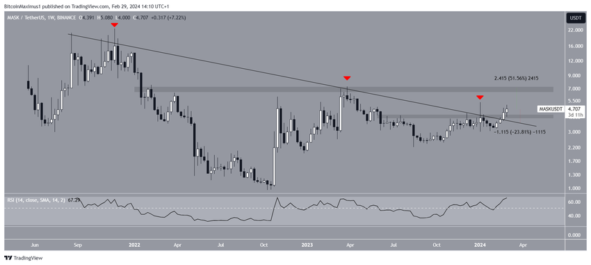 Jika momentum bullish berlanjut, MASK berpotensi terbang lagi hingga setinggi 50% untuk mencapai resistance berikutnya di level US$7.