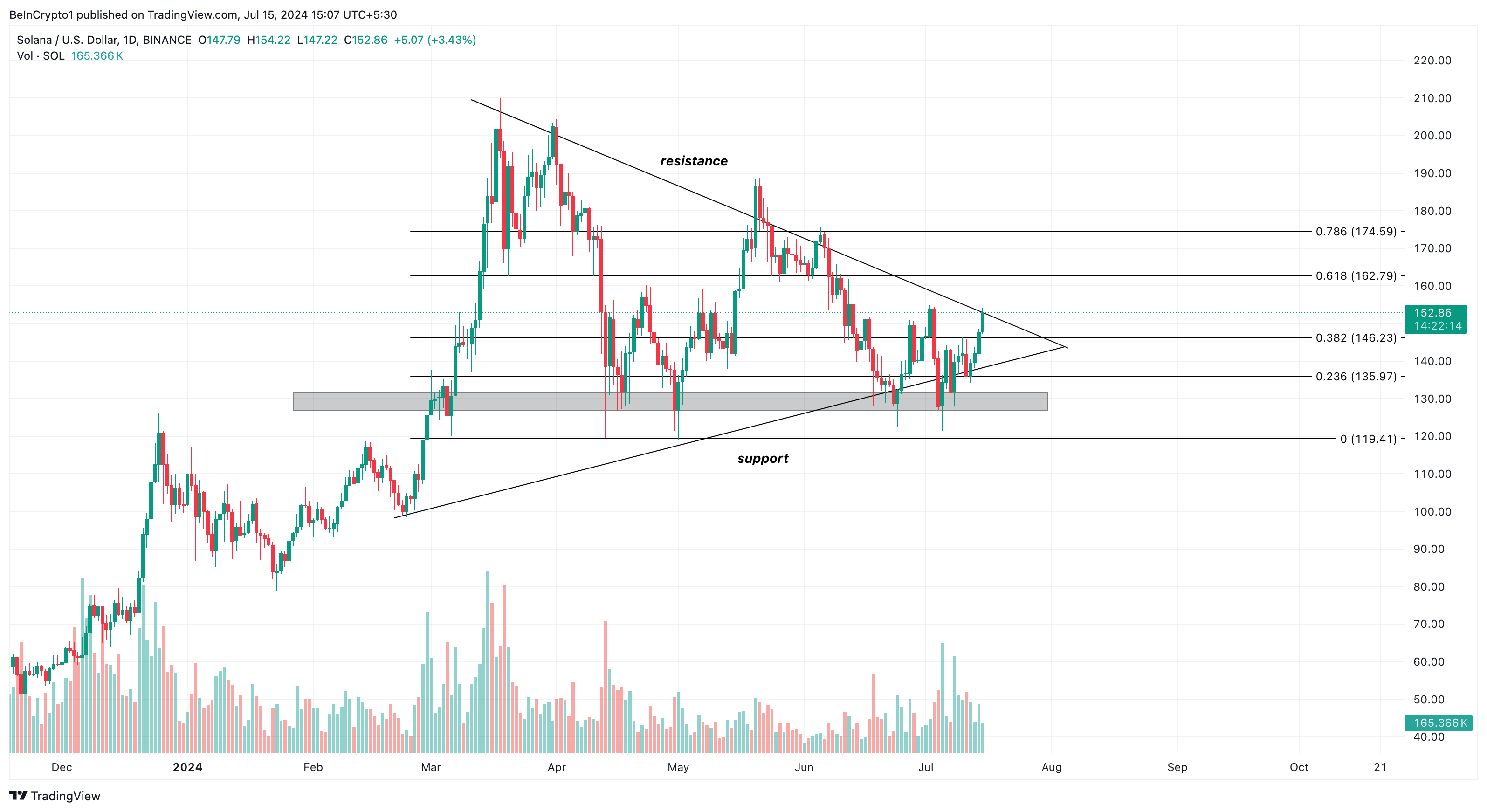Grafik harian SOL/USD saat ini memperlihatkan altcoin ini sudah membentuk segitiga simetris. Pola grafik ini dicirikan oleh garis tren konvergen yang menghubungkan serangkaian level tertinggi yang lebih rendah (lower high) dan level terendah yang lebih tinggi (higher low).