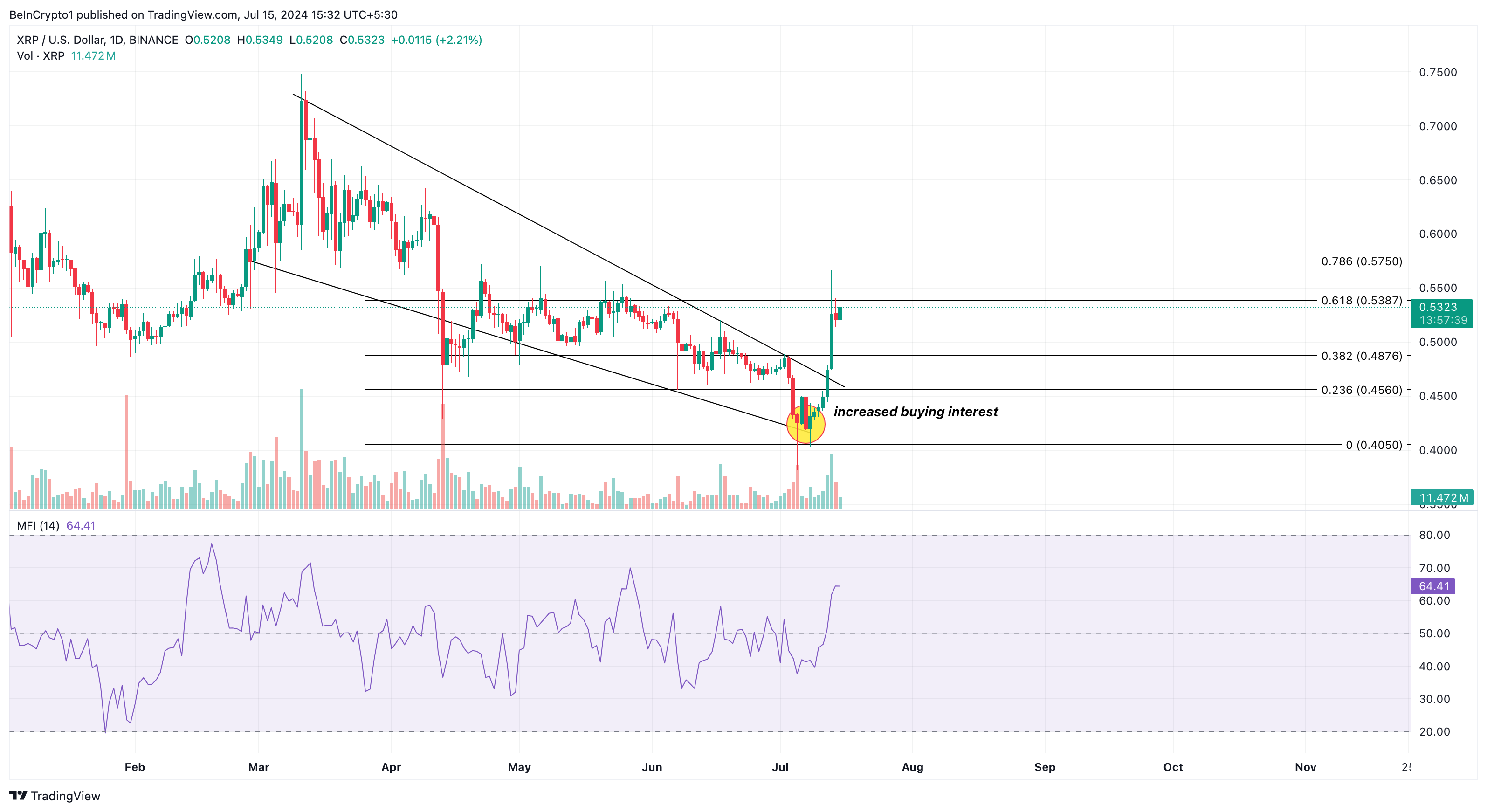 Awalnya, XRP sempat berjumpa dengan saluran menurun (descending channel) bulan jamak. Kala itu, tercatat garis tren menurun menghubungkan serangkaian lower high dan lower low. Namun, analisis mengungkap bahwa altcoin ini meledak seusai minat beli membludak di area US$0,42. Fenomena ini lantas menyebabkan kenaikan token menjadi US$0,53.