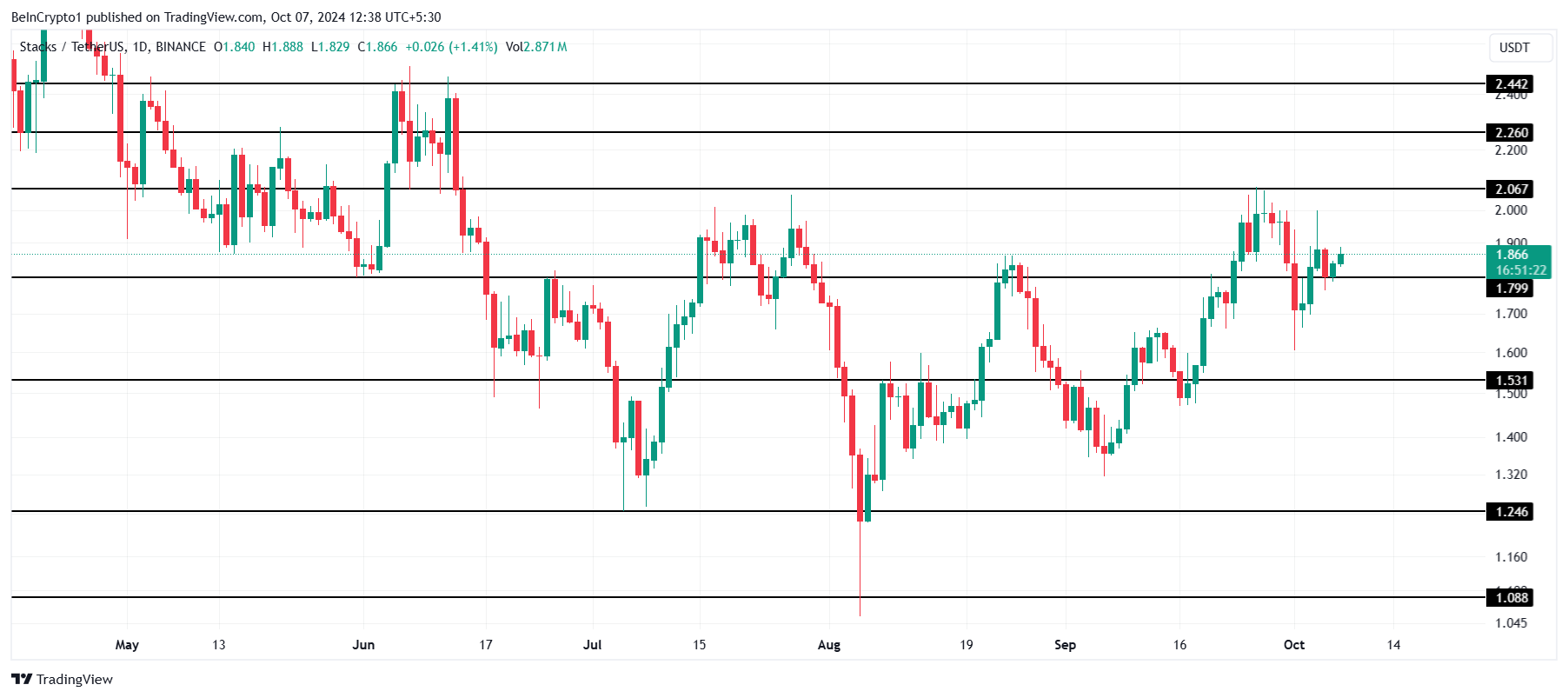 Akibatnya, harga STX diprediksi bakal naik ke level resistance krusial berikutnya, US$2,06. Jika berhasil menembusnya, akan memungkinkan kenaikan ke titik US$2,26 yang juga menjadi level tertinggi empat bulan untuk altcoin tersebut.