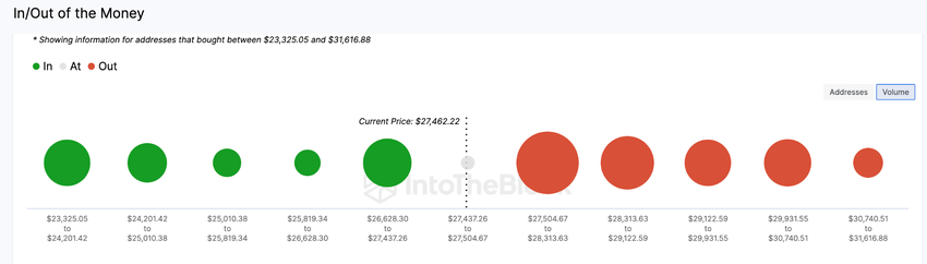 Selanjutnya, data dari metrik In Out of Money Around Price IntoTheBlock menunjukkan bahwa kecil kemungkinan Bitcoin akan ambruk di bawah US$27.000.
