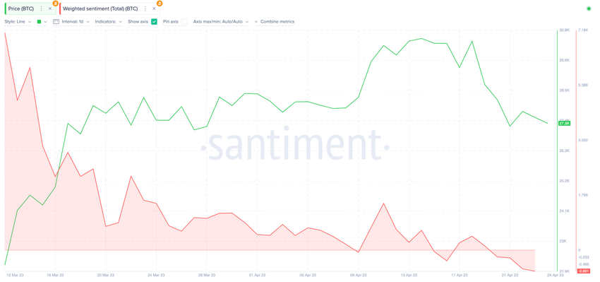 Dalam grafik di bawah ini, terlihat bahwa weighted sentiment Bitcoin menjadi negatif setelah menurun dari 1,53 ke -0,70 antara 11 April dan 24 April.