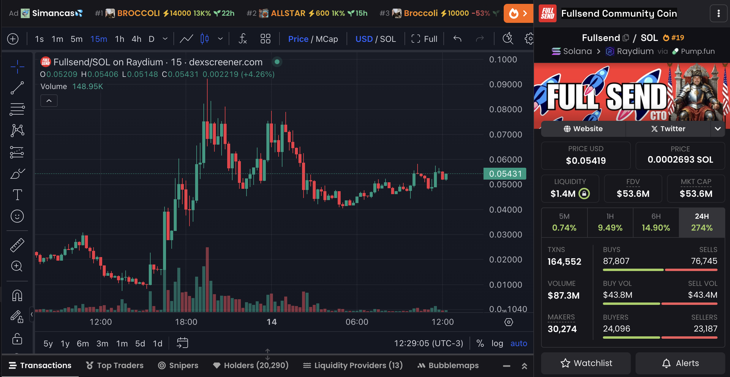 FULLSEND diluncurkan hanya empat hari yang lalu di Pumpfun dan dengan cepat mendapatkan perhatian besar, mencapai kapitalisasi pasar US$54 juta. Dalam 24 jam terakhir saja, tercatat lebih dari 164.000 transaksi dan menarik lebih dari 20.000 holder. Ini menjadikannya salah satu aset kripto baru yang paling aktif diperdagangkan di Solana.