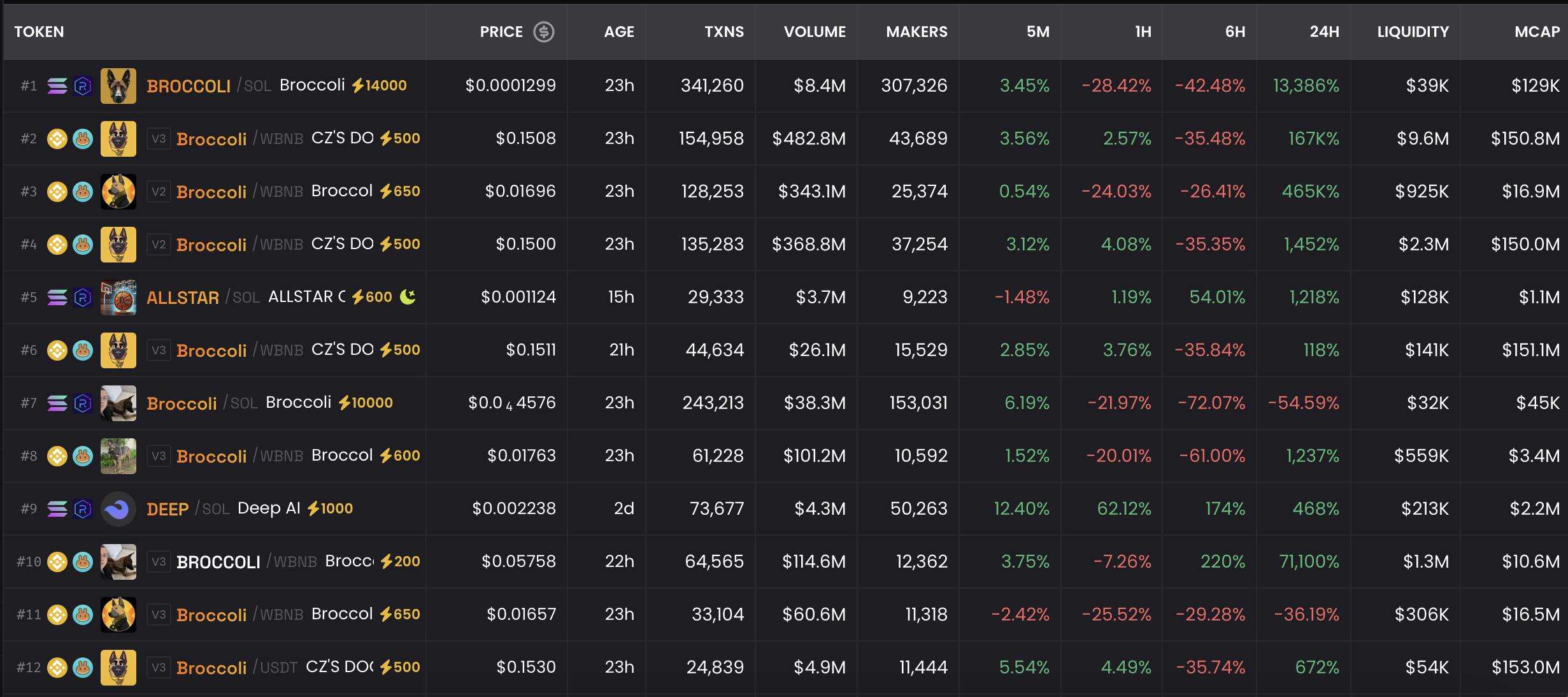 BROCCOLI, FULLSEND, dan B3 adalah beberapa aset kripto baru dengan performa terbaik minggu ini. BROCCOLI, sebuah meme coin di BNB Chain, telah meroket ke kapitalisasi pasar US$151 juta hanya dalam sehari, didorong oleh hype seputar anjing pendiri Binance, CZ.