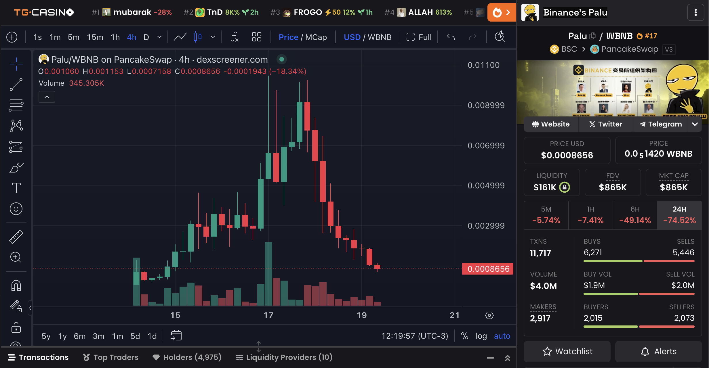 Walaupun sempat terhempas 75% dalam 24 jam terakhir—sebuah pola yang tak asing bagi meme coin di berbagai jaringan blockchain—Palu tetap mempertahankan aktivitas kuat dengan volume perdagangan harian mendekati US$4 juta.