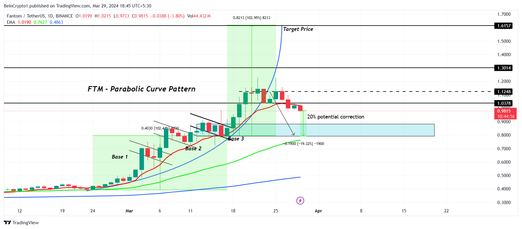 Tidak seperti aset lainnya dalam daftar ini, harga Fantom (FTM) diperkirakan tidak akan naik dalam sebulan mendatang. Alasannya adalah karena FTM berpeluang terkoreksi sebesar 20% berdasarkan pola kurva parabolik.