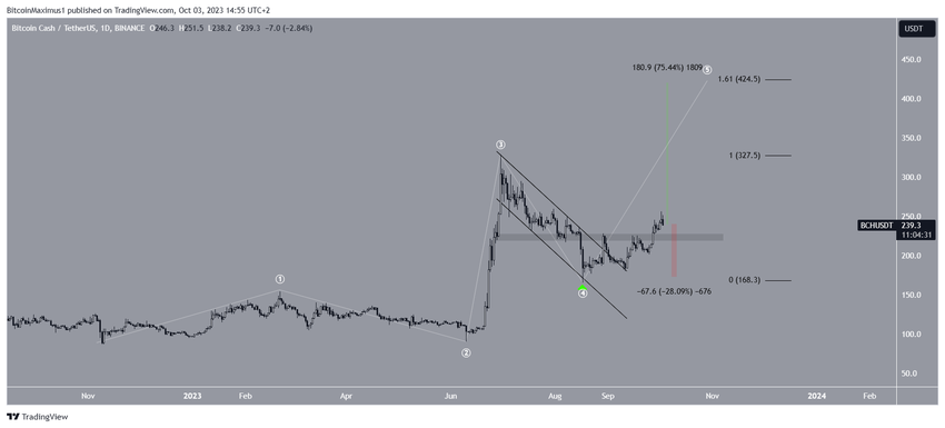 Indikator wave count yang paling mungkin menunjukkan bahwa harga BCH kini berada di gelombang kelima dan terakhir dari pergerakan naik (putih), yang dimulai pada November 2022.