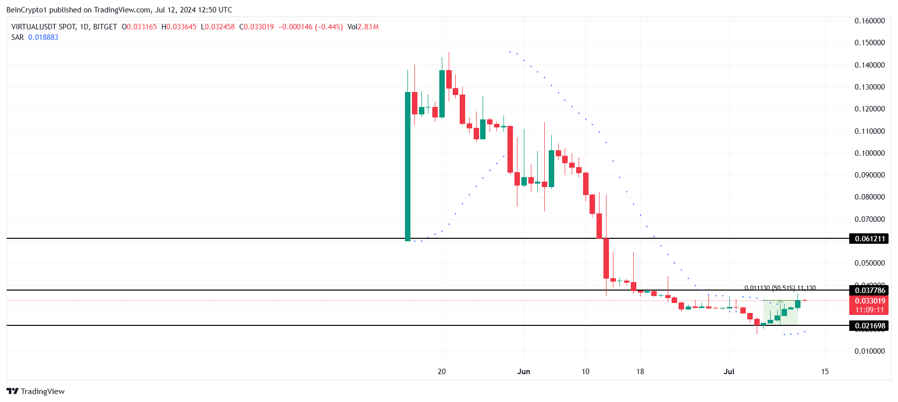 Kenaikan harga VIRTUAL memang tidak sefantastis BDP; namun, token ini masih berhasil membukukan reli harga yang mengesankan sebesar 50%. Apresiasi harga ini mengantarkan token AI ini bermuara di level US$0,037.