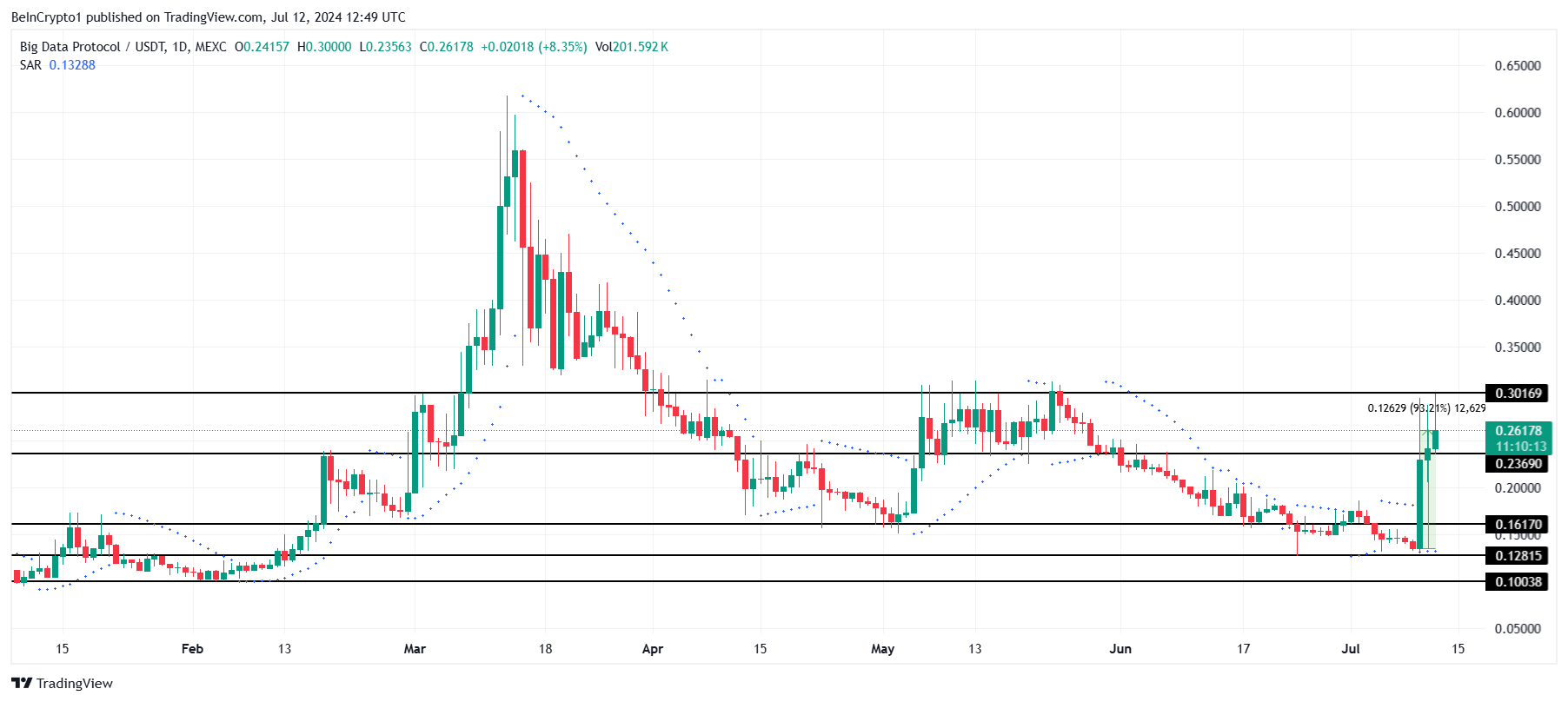 Reli harga yang BPD catat ini sanggup membawanya merangkak naik ke US$0,261 dari posisi terendah bulan jamak di US$0,129. Dengan demikian, BDP berhasil menembus dua level resistance penting sekaligus, yaitu US$0,161 dan US$0,236. Sekarang, token AI ini tengah menghadapi resistance di US$0,301, yang akan membuat aset ini memasuki fase konsolidasi.