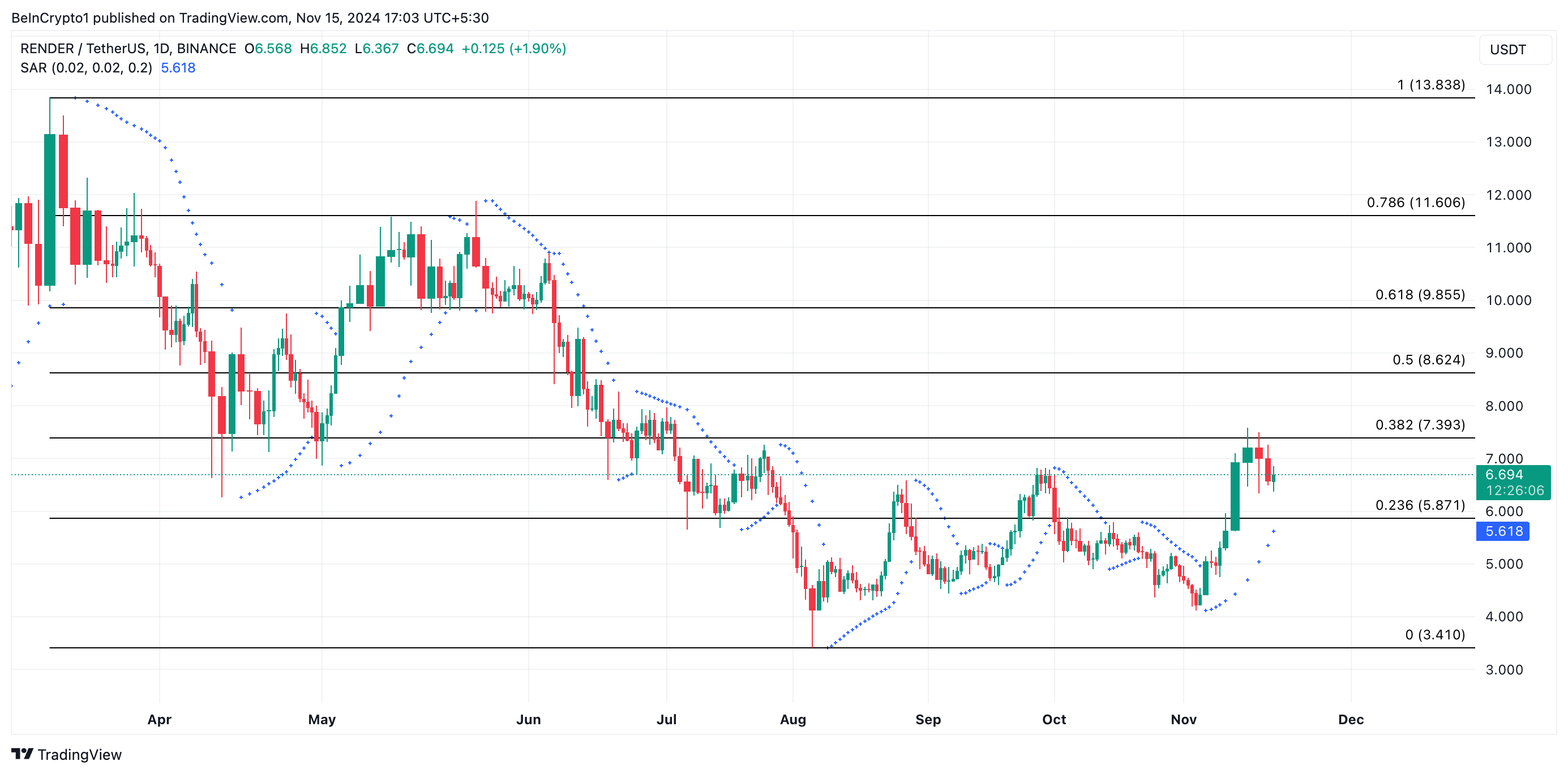 Indikator Parabolic Stop and Reverse (SAR) milik RENDER mengonfirmasi prospek bullish ini. Saat ini, titik-titik indikator, yang mengidentifikasi arah tren suatu aset dan potensi titik reversal, berada di bawah harga RENDER.