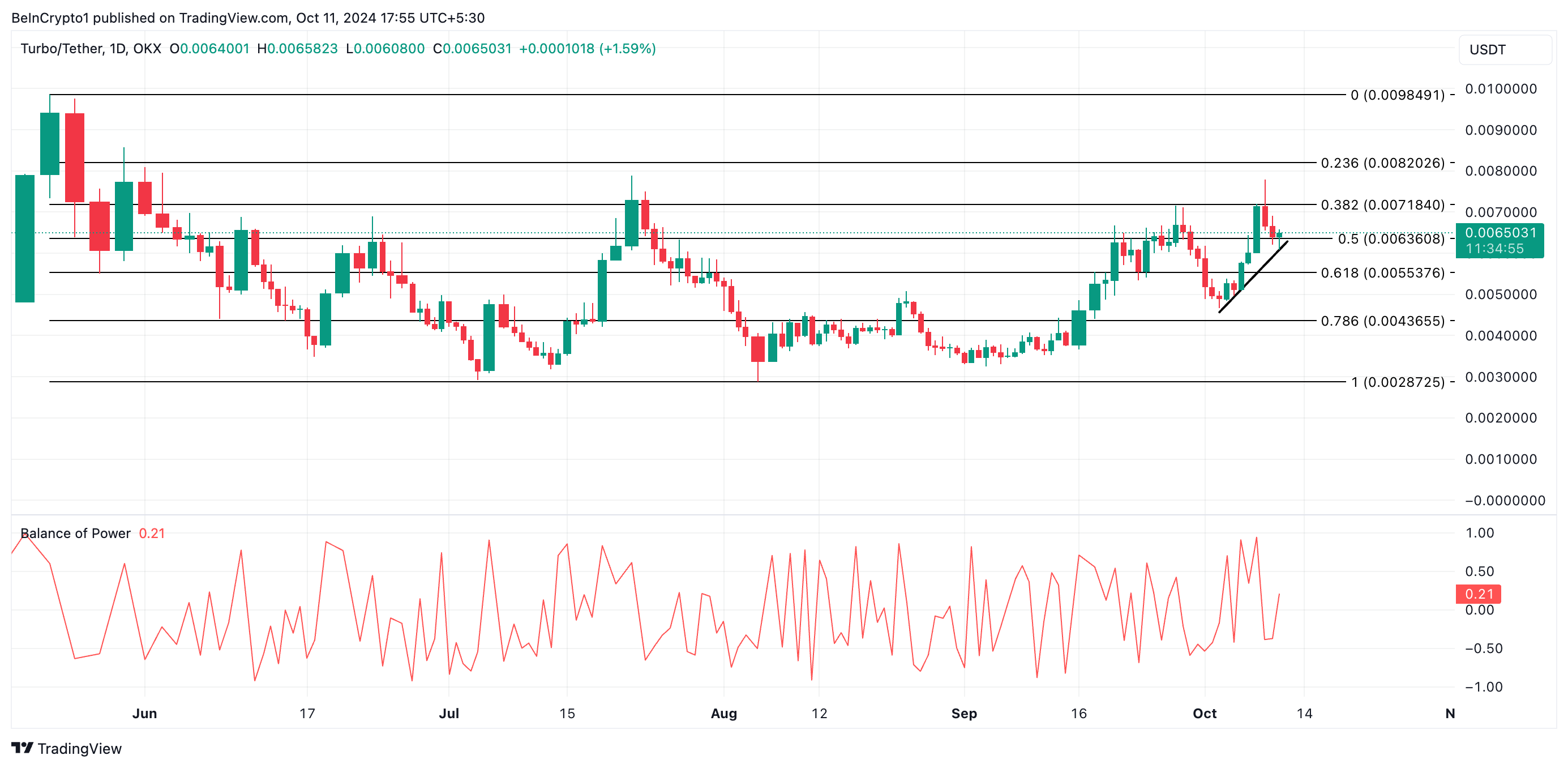 Dideskripsikan sebagai meme coin pertama yang diciptakan oleh AI, TURBO sudah naik 25% dalam seminggu terakhir. Kinerjanya yang dinilai pada grafik satu hari menunjukkan harganya bertumpu pada garis tren naik, sehingga mengonfirmasi kenaikan tersebut.