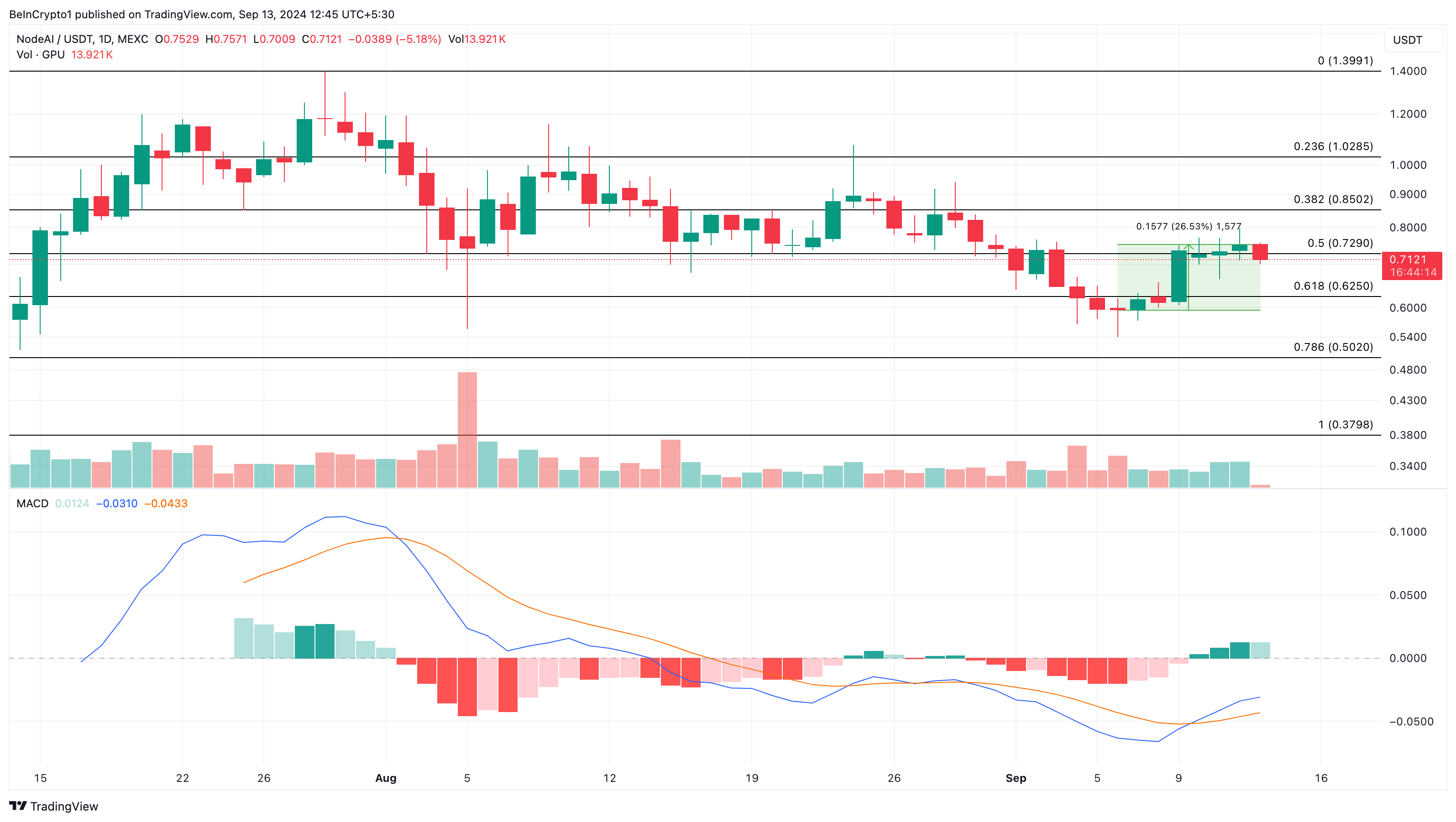 Grafik harian menunjukkan bahwa MACD, indikator momentum, masih nyaman berada di zona positif. Jika momentum ini terus berlanjut, harga GPU berpotensi naik hingga US$0,85. Namun, jika aksi ambil untung malah melonjak, proyeksi ini bisa batal, dan harga GPU terancam turun ke US$0,62.