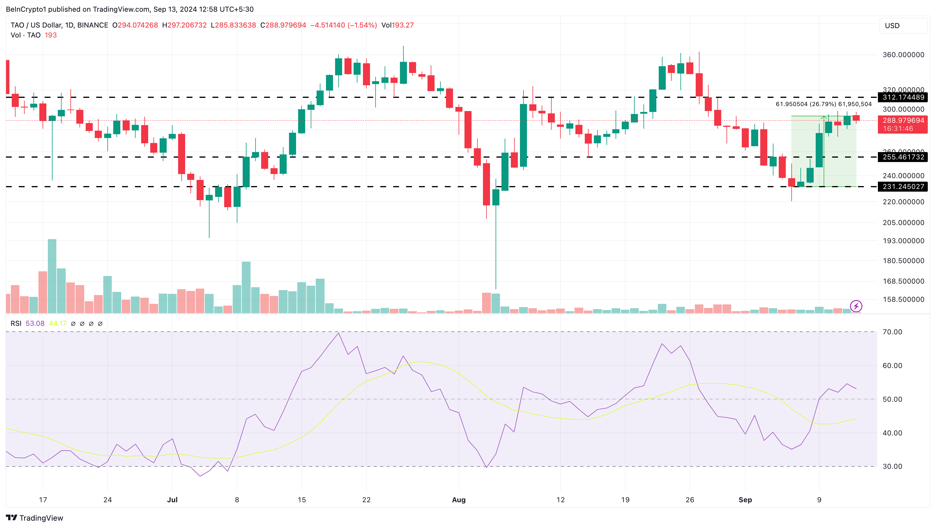 TAO, native token dari jaringan pembelajaran mesin (machine learning) terdesentralisasi Bittensor, mencatat kenaikan harga sebesar 26%. Pada 6 September, harga TAO berada di level support krusial di US$231,24.