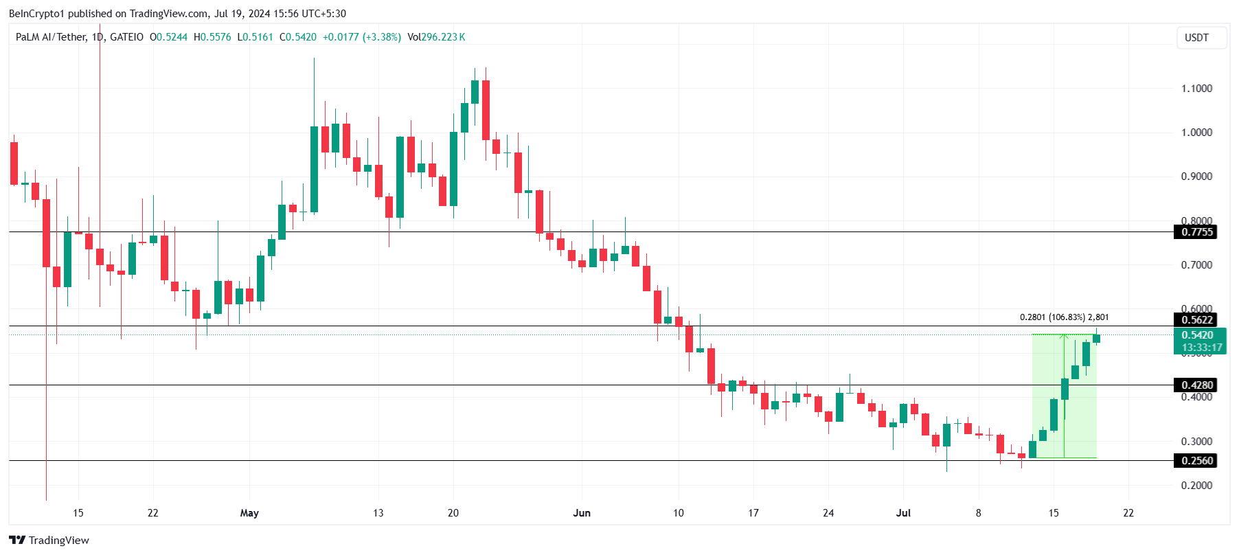 Palm AI adalah salah satu dari segelintir altcoin yang mencatat pertumbuhan konsisten. Sepanjang minggu, PALM tidak mengukir apa pun selain pola candlestick hijau. Ini lantas memantik harga sang token AI naik sebesar 106%, membawa altcoin ini diperdagangkan seharga US$0,54.