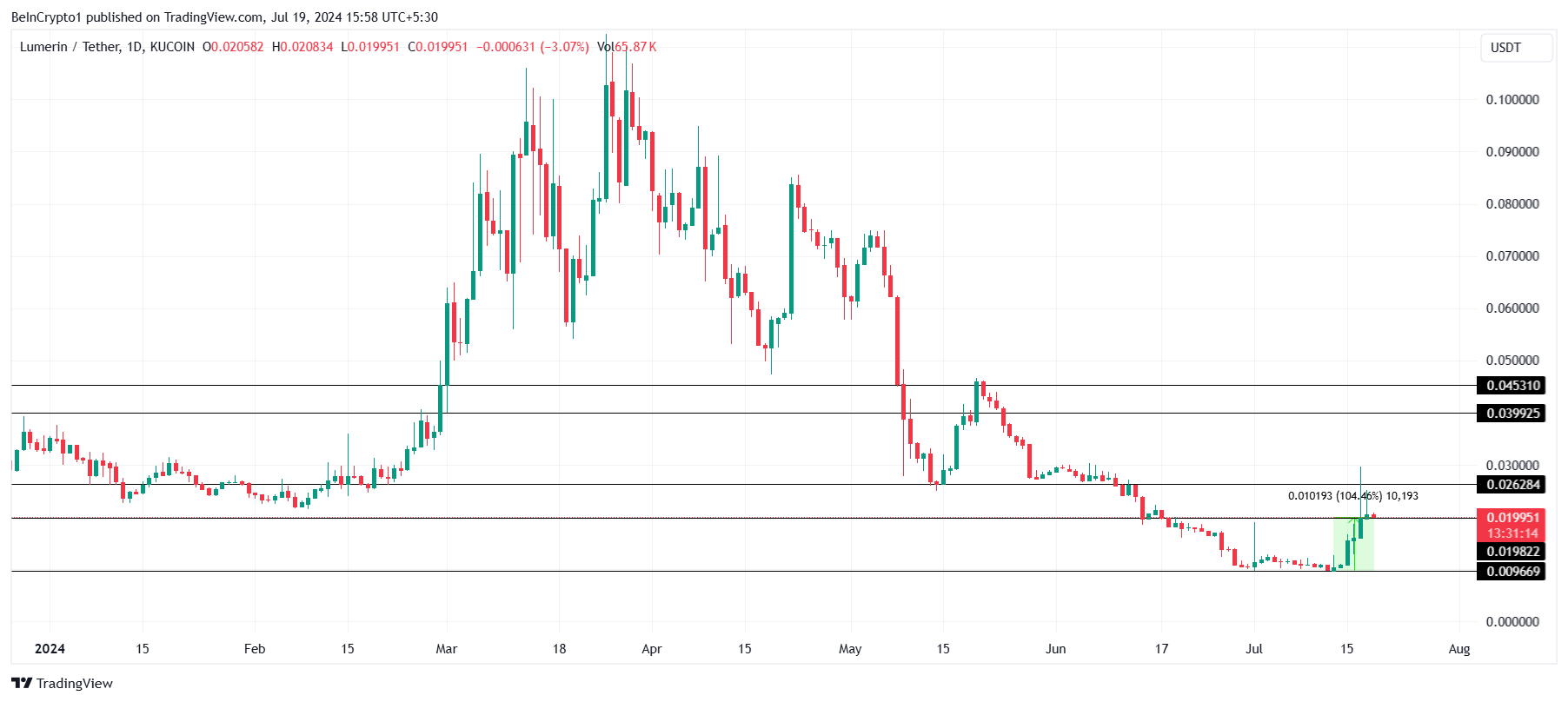 Top gainer terkemuka lainnya pekan ini adalah Lumerin, yang, terlepas dari berbagai masalah, berhasil mencatat reli sebesar 104%. Meskipun token artificial intelligence ini sudah meningkat pesat, altcoin ini hampir mencapai US$0,030.