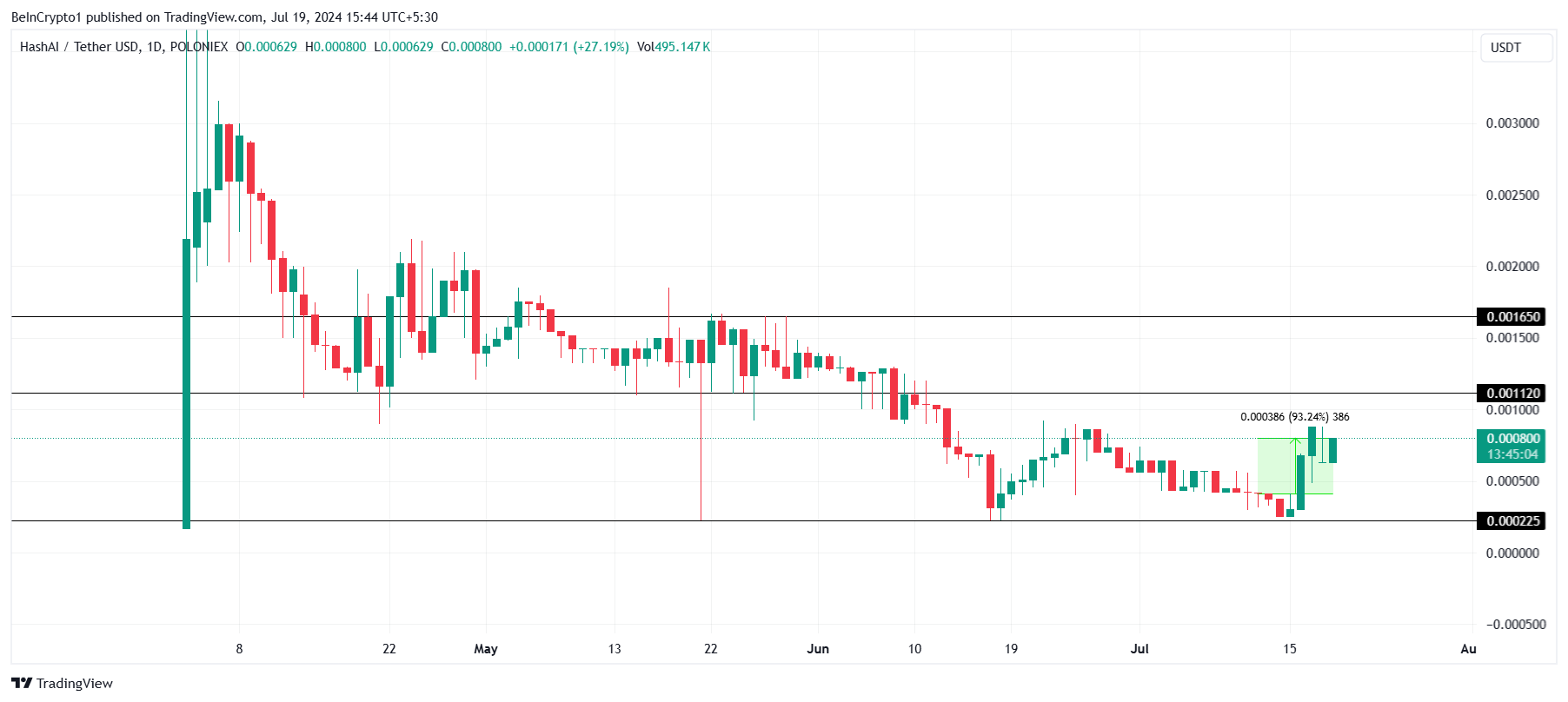 Mengikuti jejak token AI yang disebutkan di atas adalah Hash AI. Aset kripto ini berhasil membukukan kenaikan 93% selama seminggu. Token AI HASHAI naik dari US$0,000240 menjadi US$0,000800 pada waktu publikasi. Jika kenaikan ini berlanjut, HASHAI barang tentu bisa menerobos area US$0,001000.