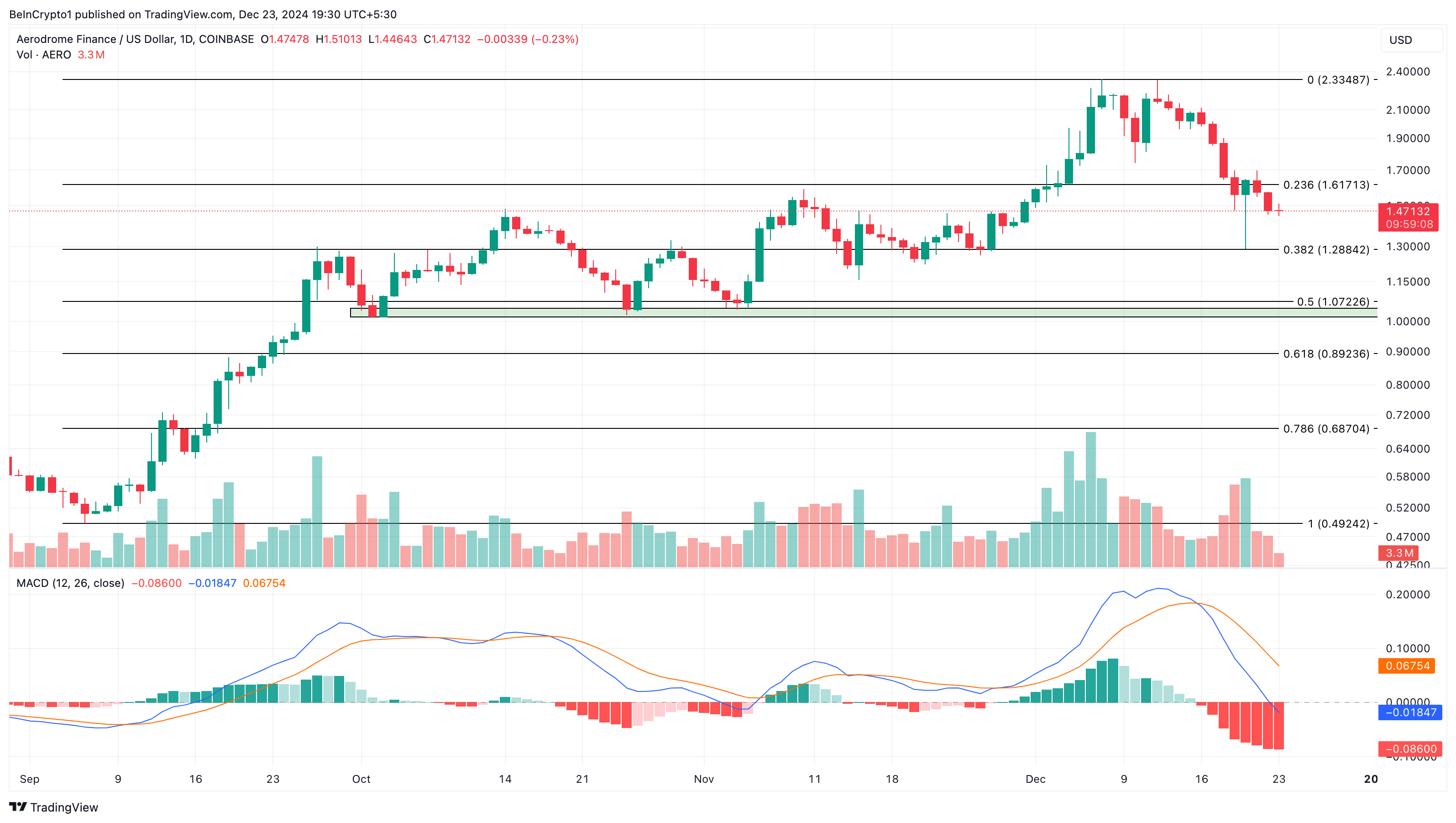 Saat ini, harga AERO bertengger di angka US$1,47. Adapun grafik harian menunjukkan support signifikan di sekitar US$1,05. Namun, Moving Average Convergence Divergence (MACD) telah terperosok ke area negatif.