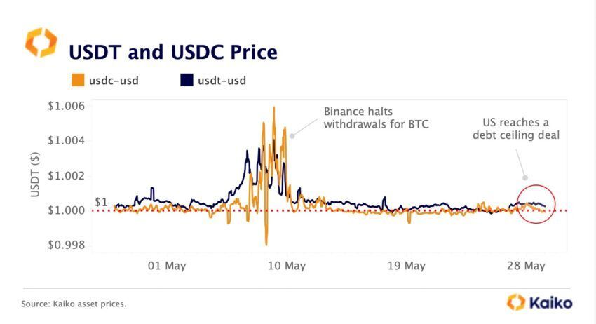 Di sisi lain, Kaiko juga menyatakan bahwa diskusi mengenai negosiasi batas utang AS, yang saat ini sudah mendekati tahap penyelesaian, tidak berdampak pada harga stablecoin. Dengan begitu, hal ini menunjukkan bahwa stablecoin telah mencapai tingkat kestabilan yang aman.