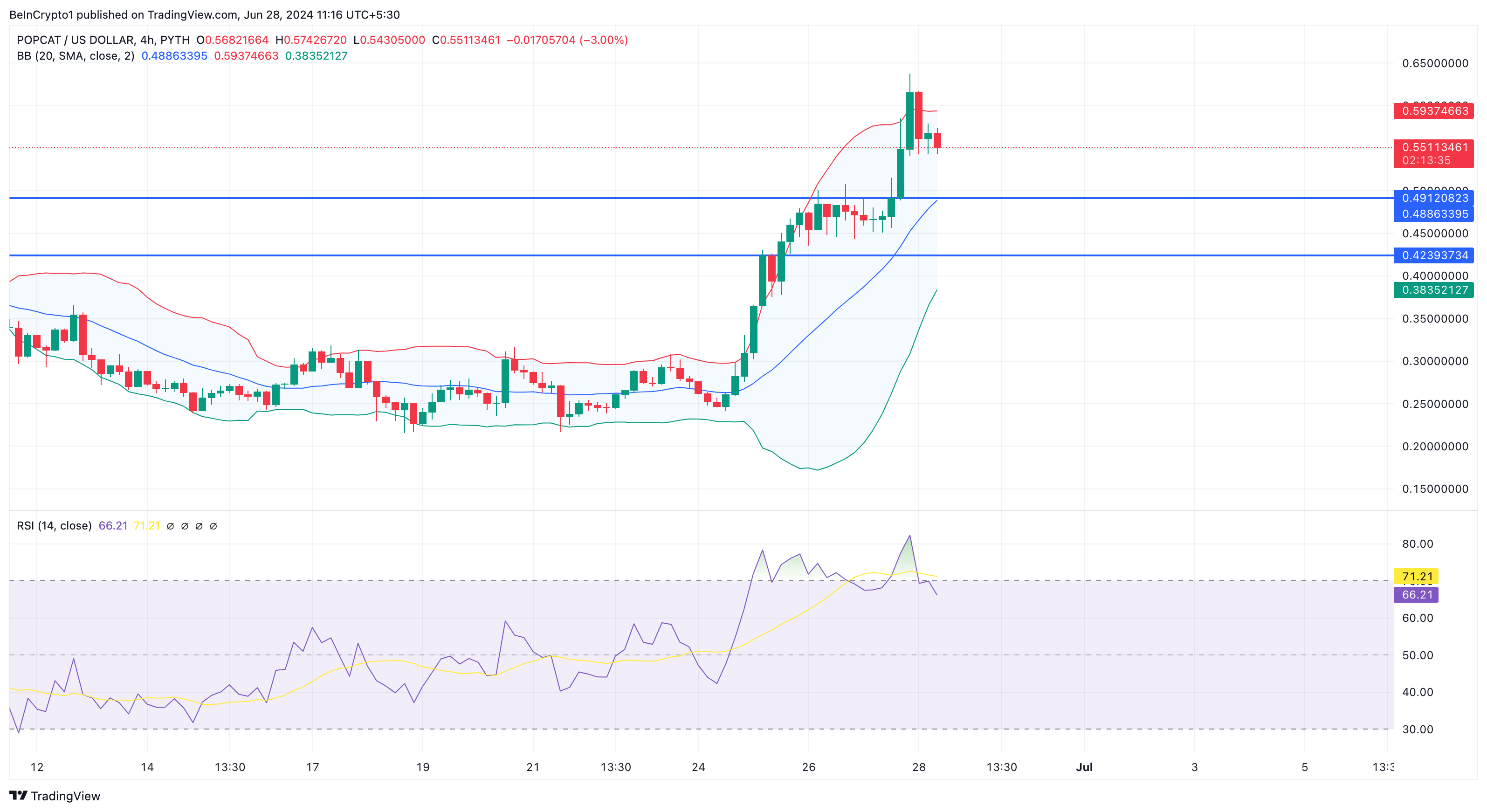 Sebelumnya, band atas menyentuh POPCAT pada US$0,60, menunjukkan bahwa token tersebut oversold. Kemudian, terjadilah koreksi. Pada saat publikasi, harganya diperdagangkan di US$0,54. Relative Strength Index (RSI), yang awalnya terbaca di atas 70,00, menunjukkan hal serupa.