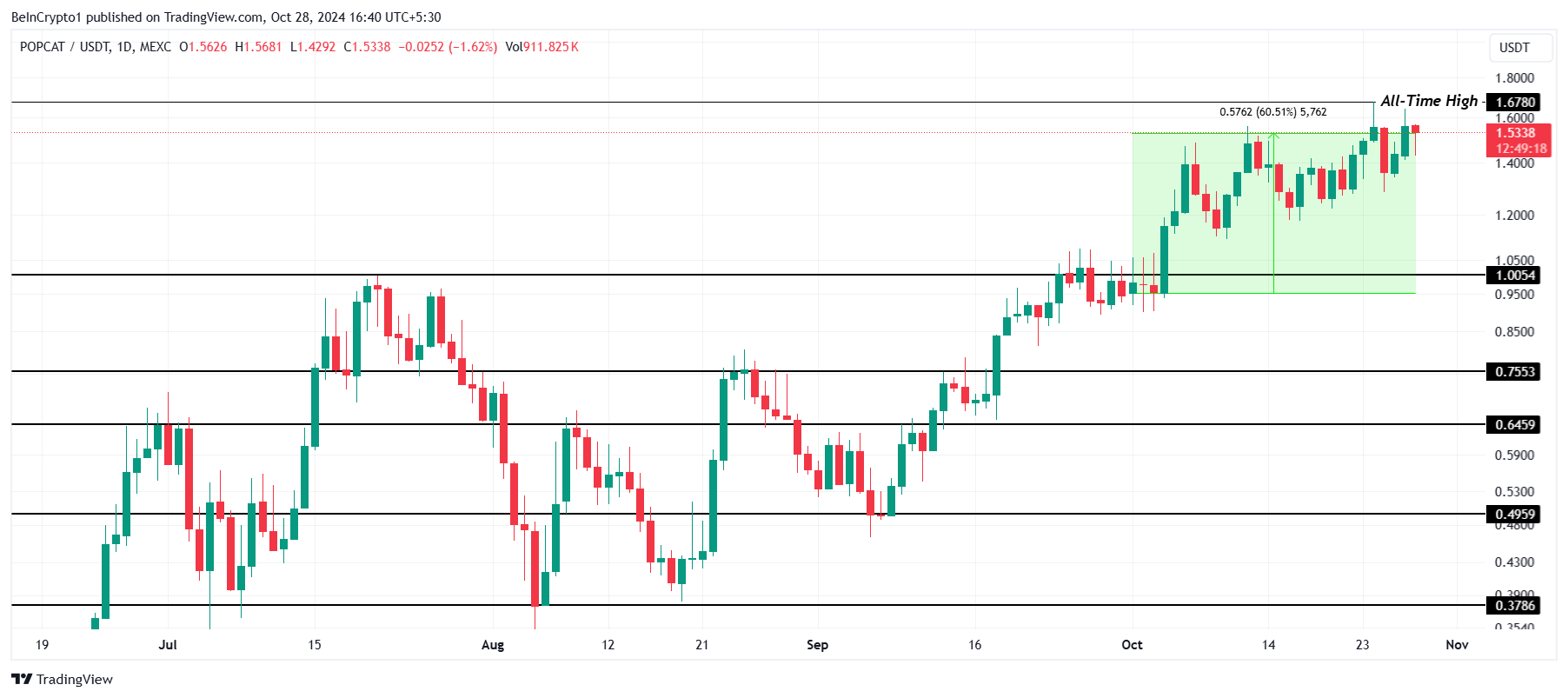 POPCAT mencetak ATH baru di US$1,67 bulan ini, menguat 60% dalam empat minggu. Walau kenaikannya tidak se-ekstrem meme token lainnya, POPCAT tetap unggul sebagai salah satu meme coin berbasis Solana yang berkinerja terbaik (top gainer). Investor tetap optimistis akan potensi harga yang terus berlanjut.