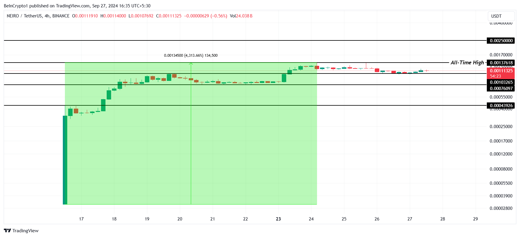 First Neiro on Ethereum (NEIRO) dengan cepat mencuri sorotan sejak peluncurannya di bulan September, meskipun menggunakan ticker yang sama dengan Neiro Ethereum. Dalam waktu kurang dari dua minggu, NEIRO mengalami lonjakan dramatis sebesar 4.313%, mencapai rekor all-time high (ATH) di angka US$0,00137.