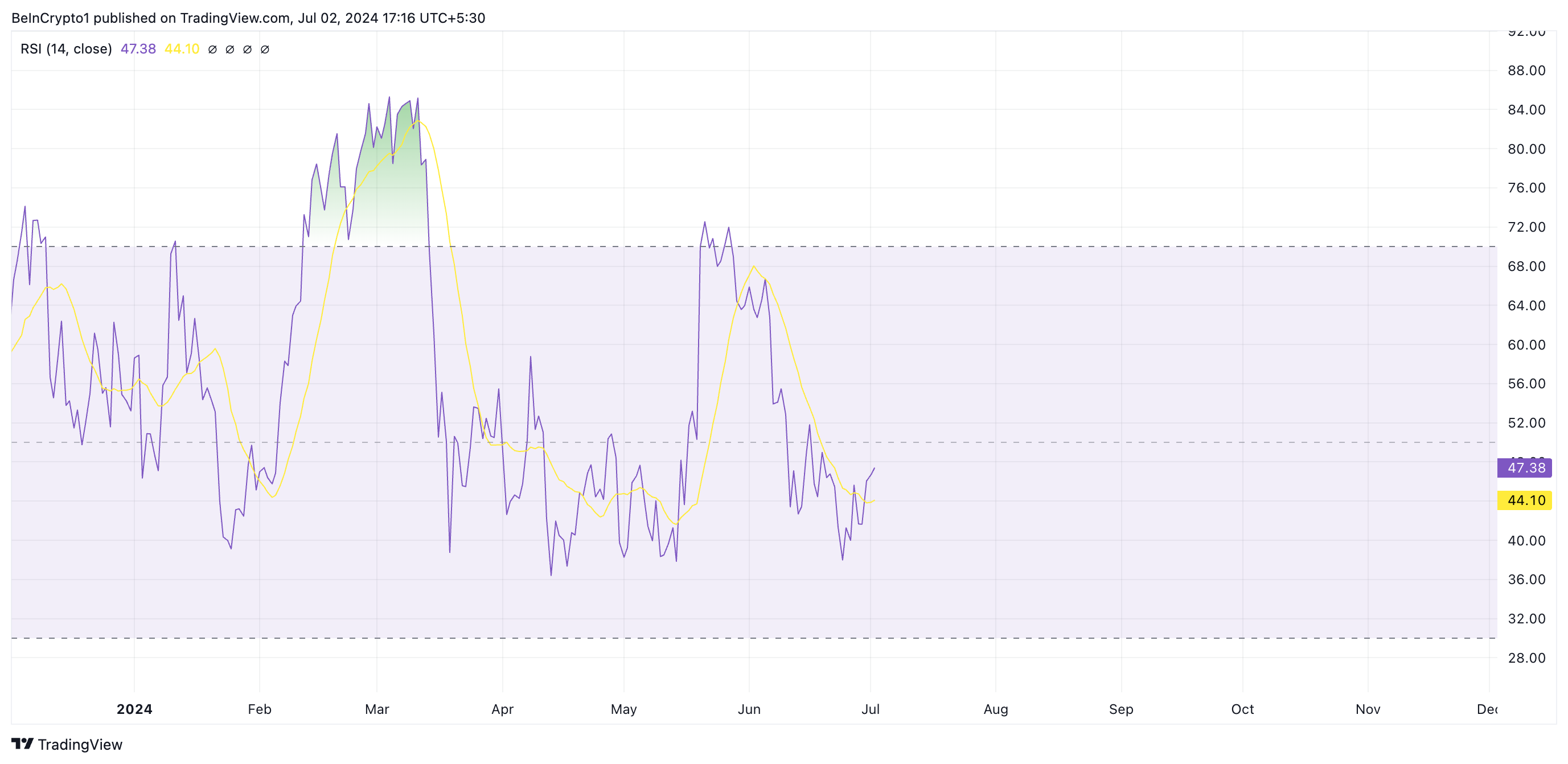 Adapun hasil pemantauan pada kinerjanya di grafik harian menguak temuan bahwa permintaan untuk ETH masih terbilang rendah. Sebagai contoh, Relative Strength Index (RSI) saat ini ada di bawah titik netral 50, tepatnya di 47,38 pada saat publikasi.