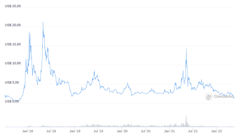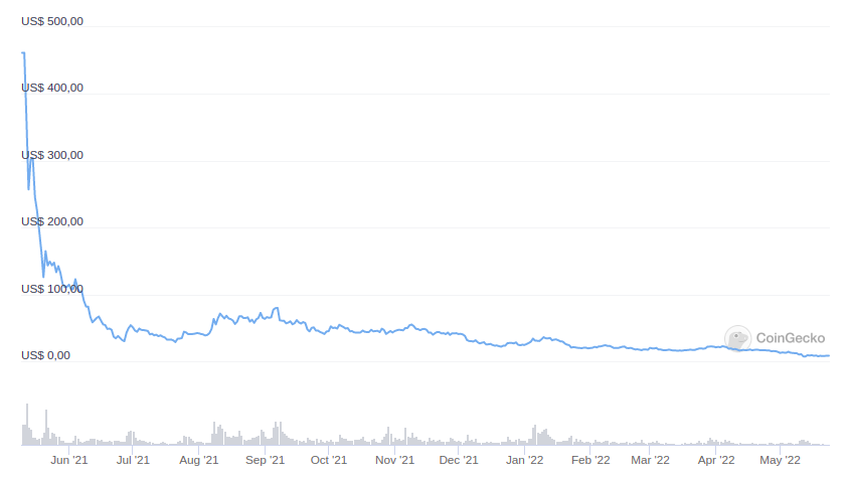 Internet Computer Token (ICP), yang dulunya seharga US$700, sekarang hanya bernilai US$8,37. Artinya, telah terjadi penurunan harga lebih dari atau setara 98,8%.