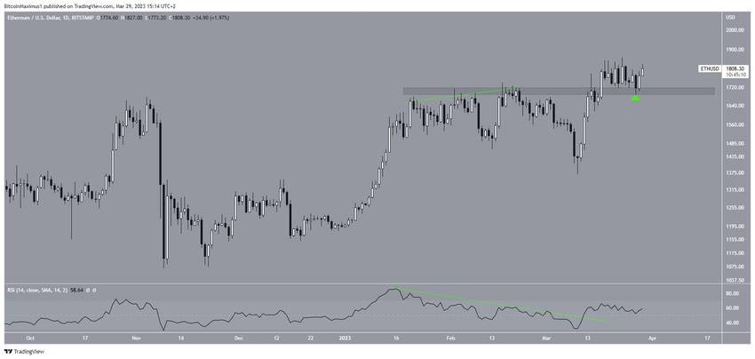 Pergerakan harga Ethereum sendiri terlihat sangat bullish. Harganya telah meningkat pesat sejak 10 Maret dan juga berhasil merebut kembali area support US$1.700 pada 17 Maret, serta memvalidasi area tersebut sebagai support 10 hari kemudian (ikon hijau).
