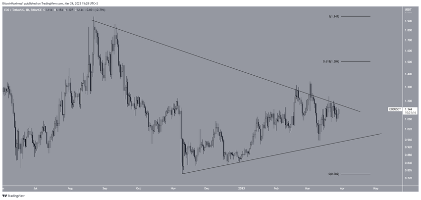 Harga EOS masih bergerak mengikuti garis descending resistance sejak bulan Agustus 2022 lalu. Jika EOS berhasil breakout, harganya bisa naik dengan cepat ke resistance berikutnya di level US$1,50.