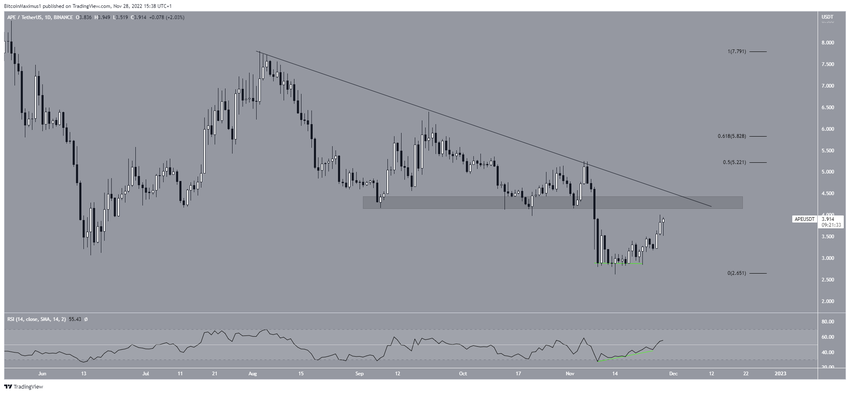 Setelah itu, RSI hariannya menghasilkan bullish divergence, mendahului aksi kenaikan harga yang tengah berlangsung dan mengalami percepatan selama 24 jam terakhir. Harga APE sendiri kemungkinan akan menghadapi resistance yang kuat di level US$4, yang diciptakan oleh area horizontal resistance dan garis descending resistance. Oleh karena itu, tembusnya harga APE kemungkinan besar akan menentukan arah tren ke depannya.