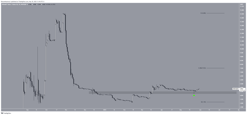 Harga WBT sendiri telah meningkat secara bertahap sejak awal Februari lalu, yakni ketika mengakhiri tren penurunan besar-besaran yang dimulai pada bulan November 2022. Kemudian pada 17 Maret, harganya bergerak di atas area resistance US$4,40 dan mengonfirmasinya sebagai level support (ikon hijau) setelah itu.