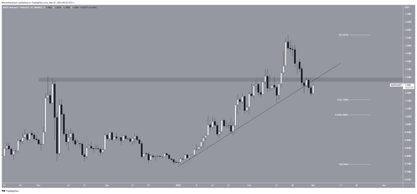 Namun, terlepas dari itu, harga Polygon (MATIC) terpantau mengalami breakdown dari garis ascending support dan ambruk di bawah area resistance horizontal US$1,28. Selama harganya belum bisa merebut kembali area tersebut, trennya masih akan tetap dianggap bearish. Oleh karena itulah, aksi turun ke level retracement support Fib 0,5-0,618 di harga US$1,06-US$1,15 berpotensi akan terjadi.