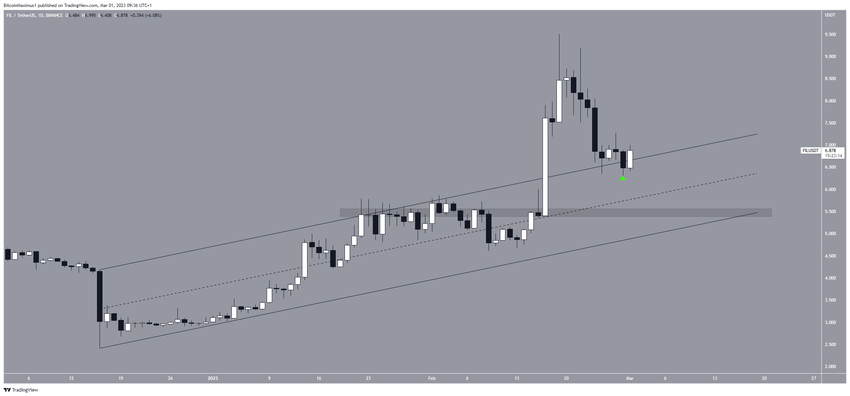 Saat ini, harga Filecoin (FIL) sedang mencoba memvalidasi ascending channel sebagai titik support (ikon hijau). Jika percobaan ini berhasil, maka selanjutnya pola candlestick bullish engulfing juga akan terbentuk.